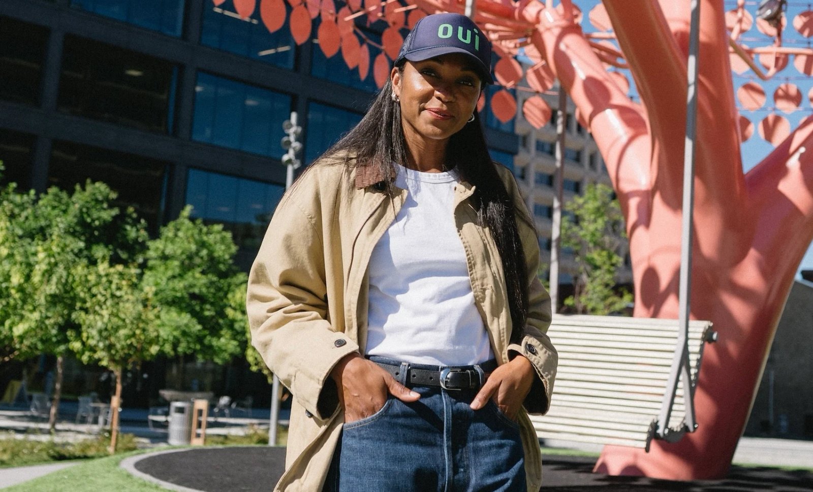 Jacket: H&M. T-shirt: Leset. Jeans: Citizens of Humanity. Belt: Old Navy. Sneakers: Reebok. Baseball cap: Clare V. Earrings: Gorjana.