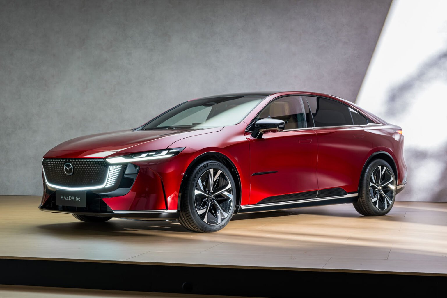 Revealed at the start of 2025, the 6e joins the larger and technically related CX-6e SUV in ushering in the next evolution of Mazda’s Kodo design language, with a low roofline, frameless doors and LED lights encircling the front grille.